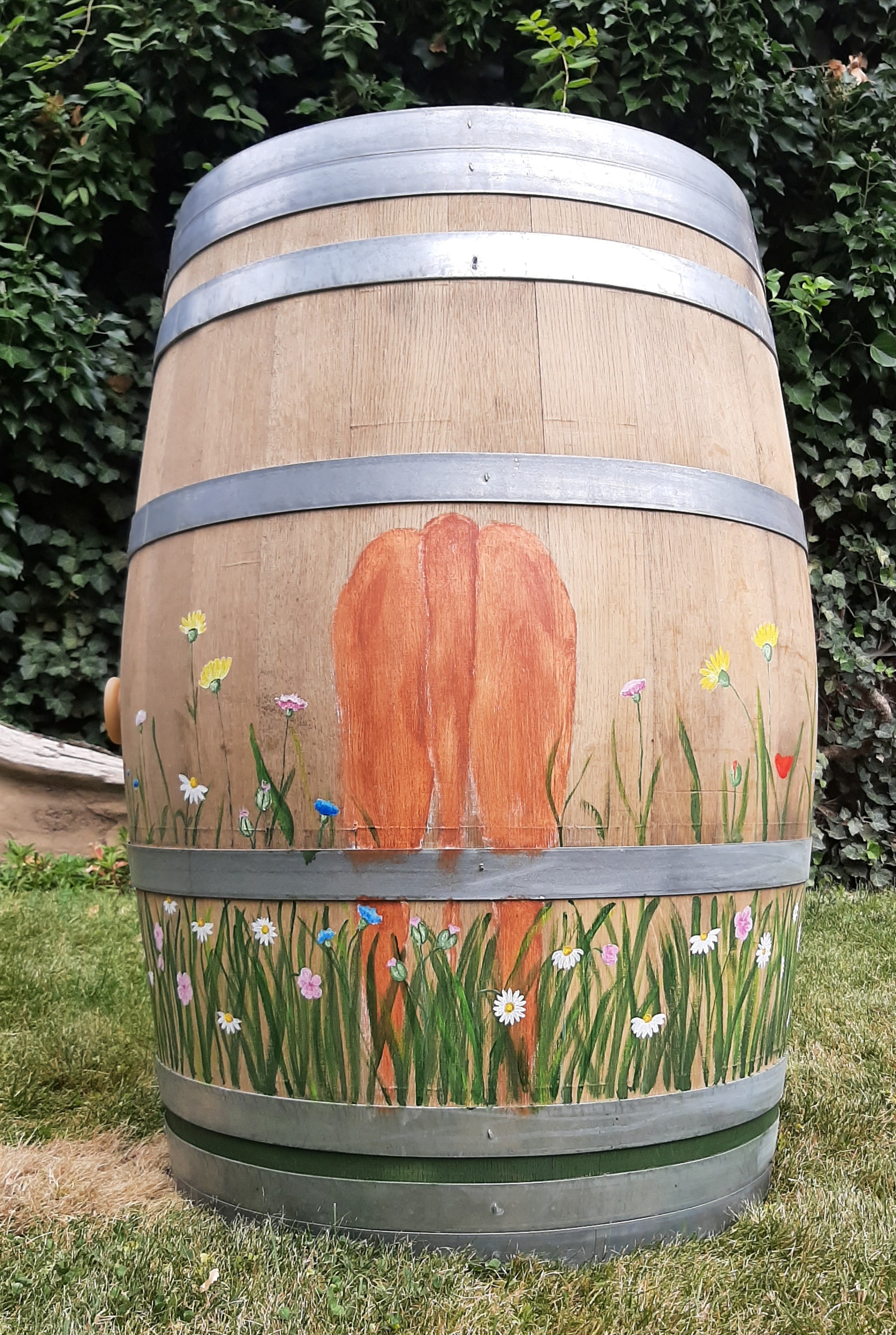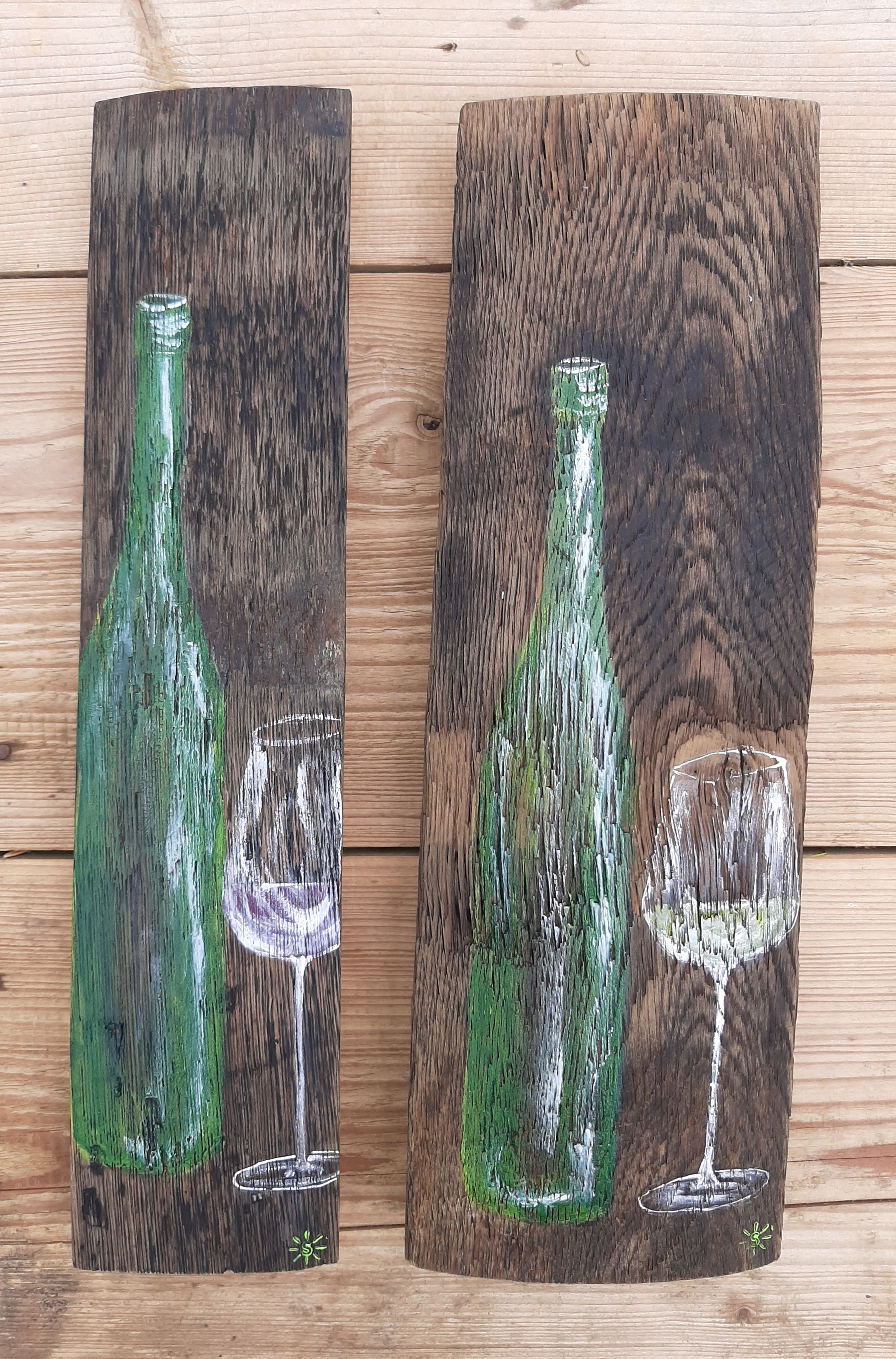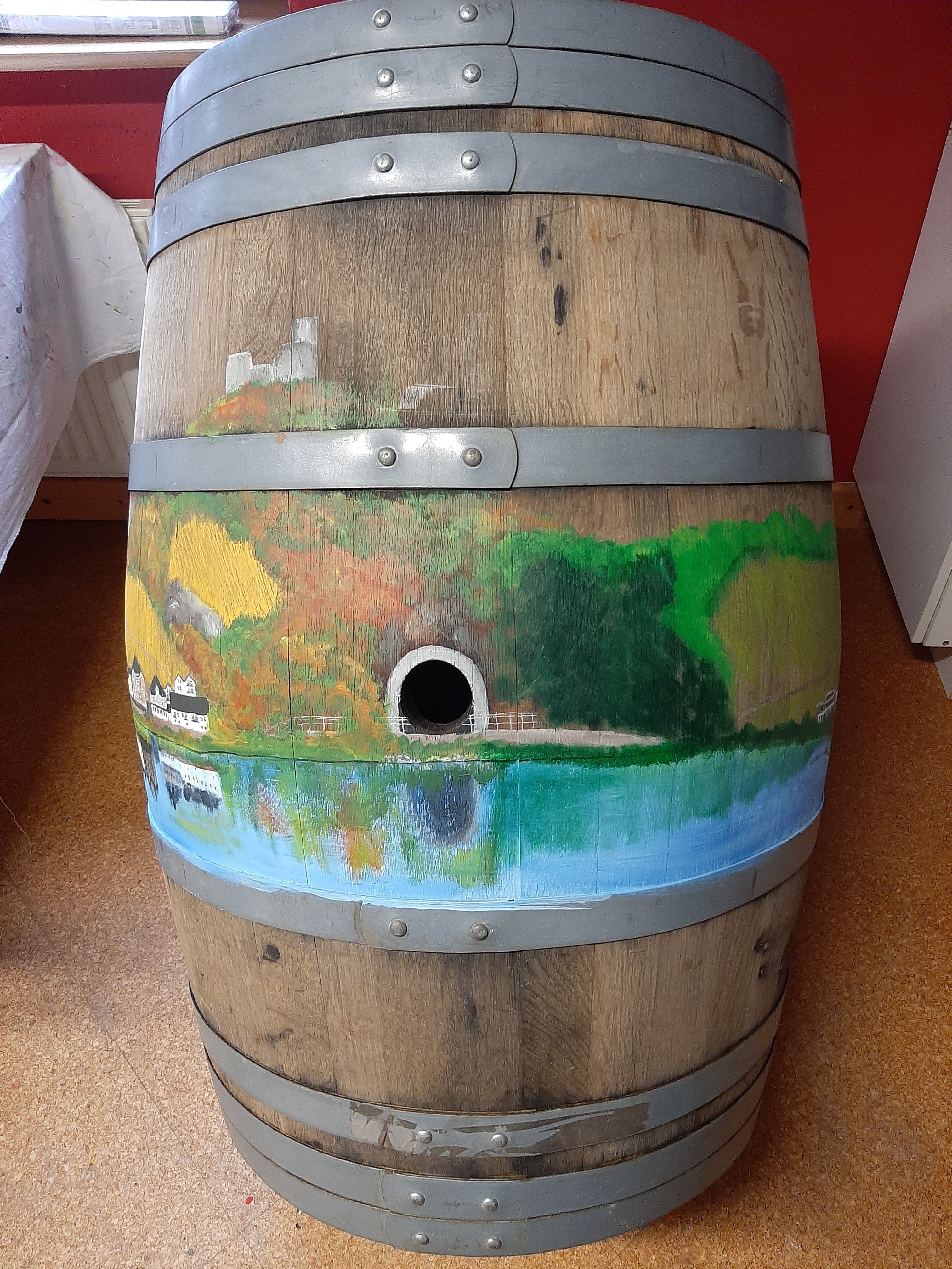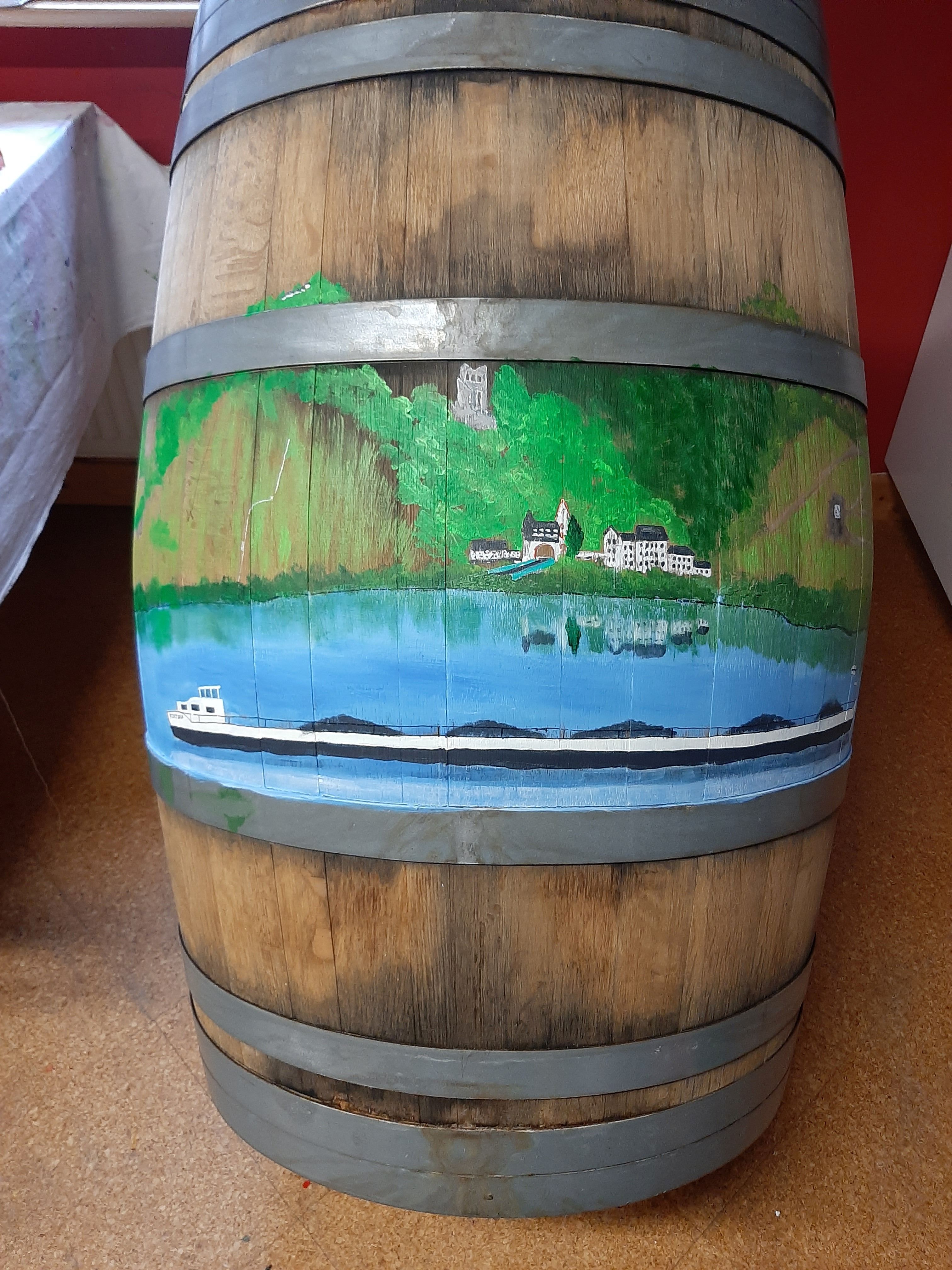 Die hier bemalten Fassdauben sind gebogene Eichenbohlen, die einst ein Fass bildeten. Wenn ein Fass ausgedient hat, wird es in der Regel auseinandergeschlagen und die einzelnen Bohlen entsorgt. Einige Künstler an der Mosel und am Rhein „retten“ die Hölzer, indem Sie ein zweites Leben bekommen.