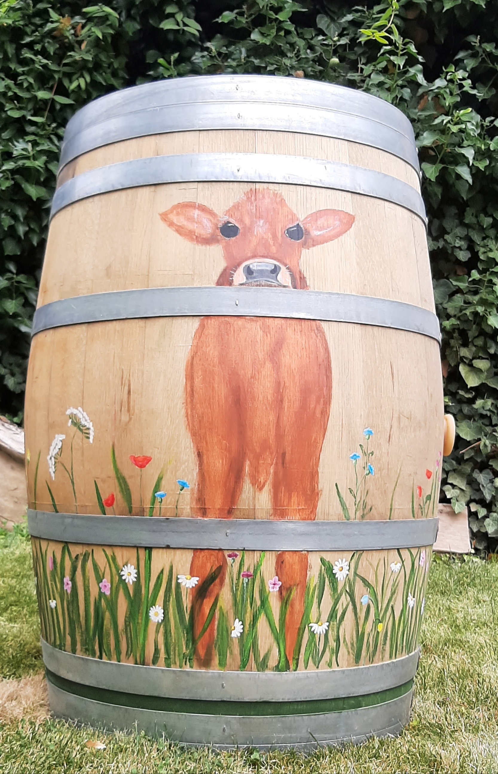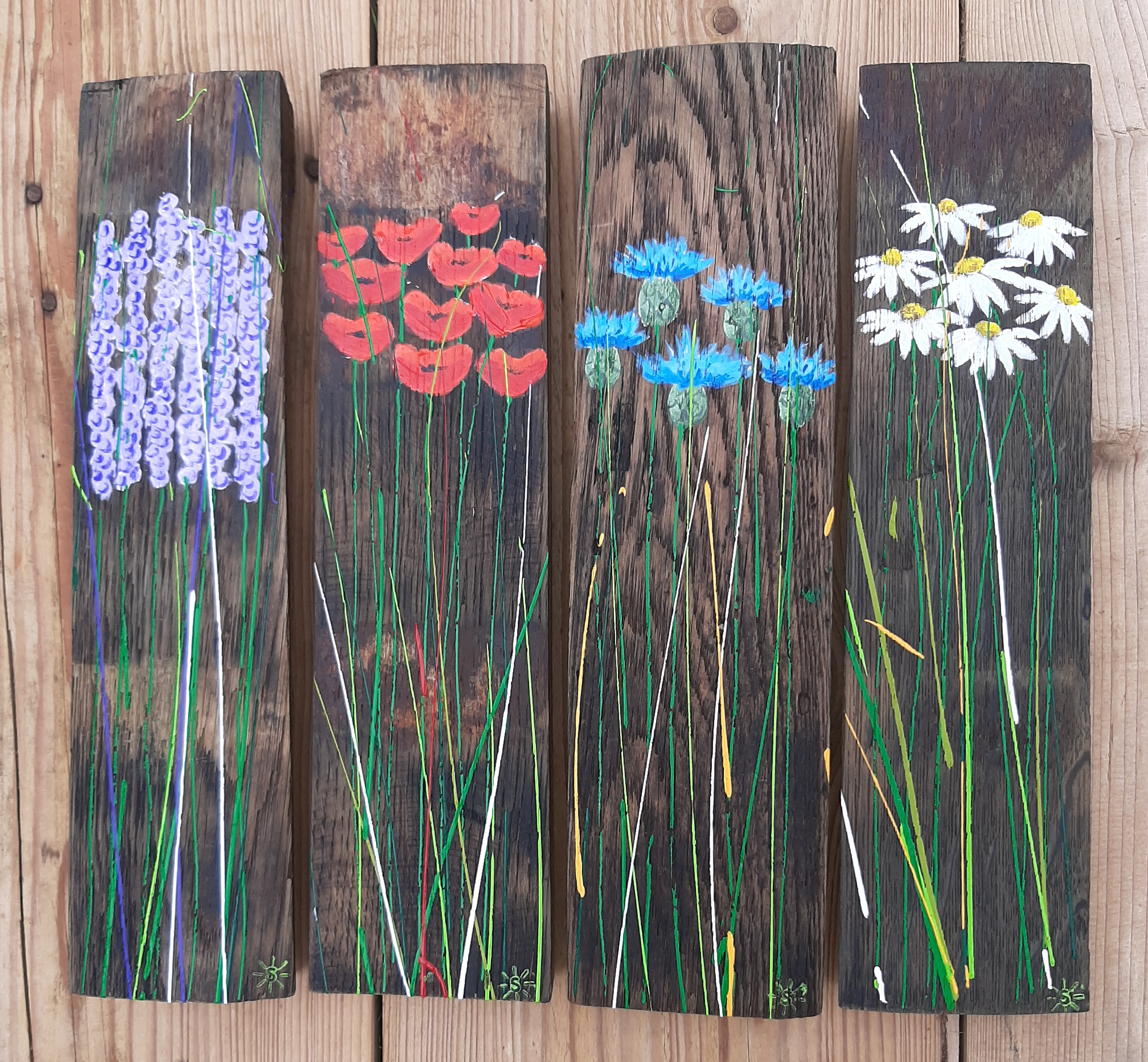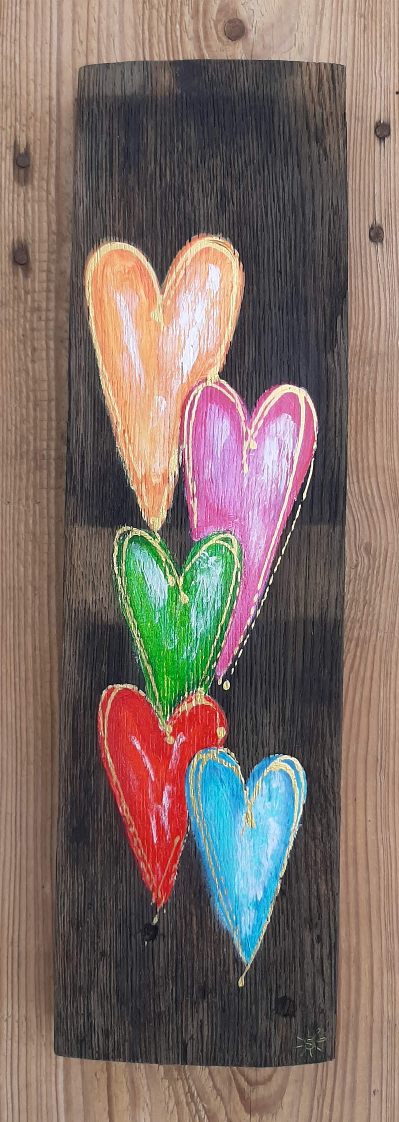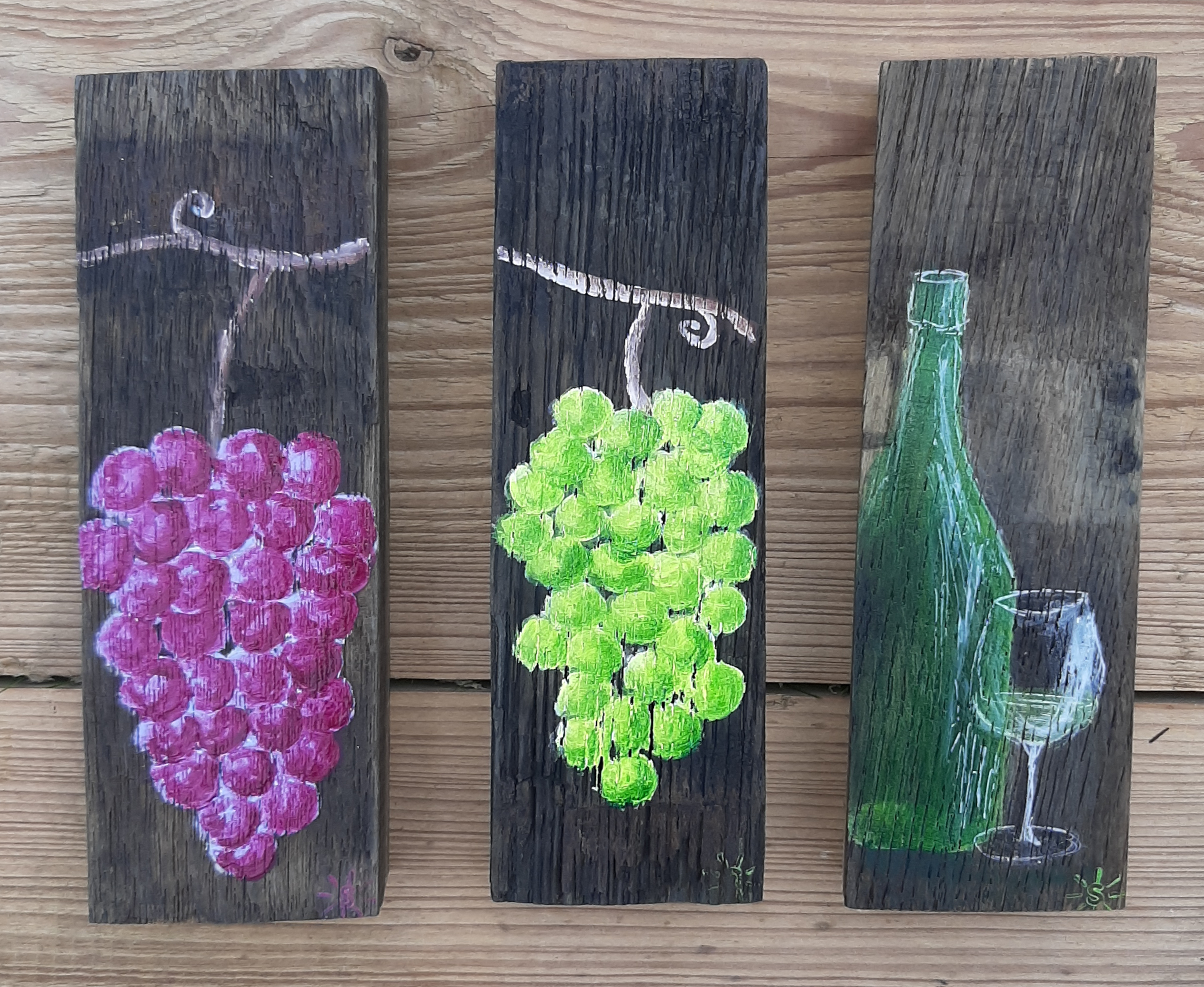 Die hier bemalten Fassdauben sind gebogene Eichenbohlen, die einst ein Fass bildeten. Wenn ein Fass ausgedient hat, wird es in der Regel auseinandergeschlagen und die einzelnen Bohlen entsorgt. Einige Künstler an der Mosel und am Rhein „retten“ die Hölzer, indem Sie ein zweites Leben bekommen.